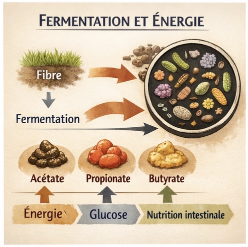 Les micro-organismes fermentent les fibres végétales (cellulose, hémicellulose)
