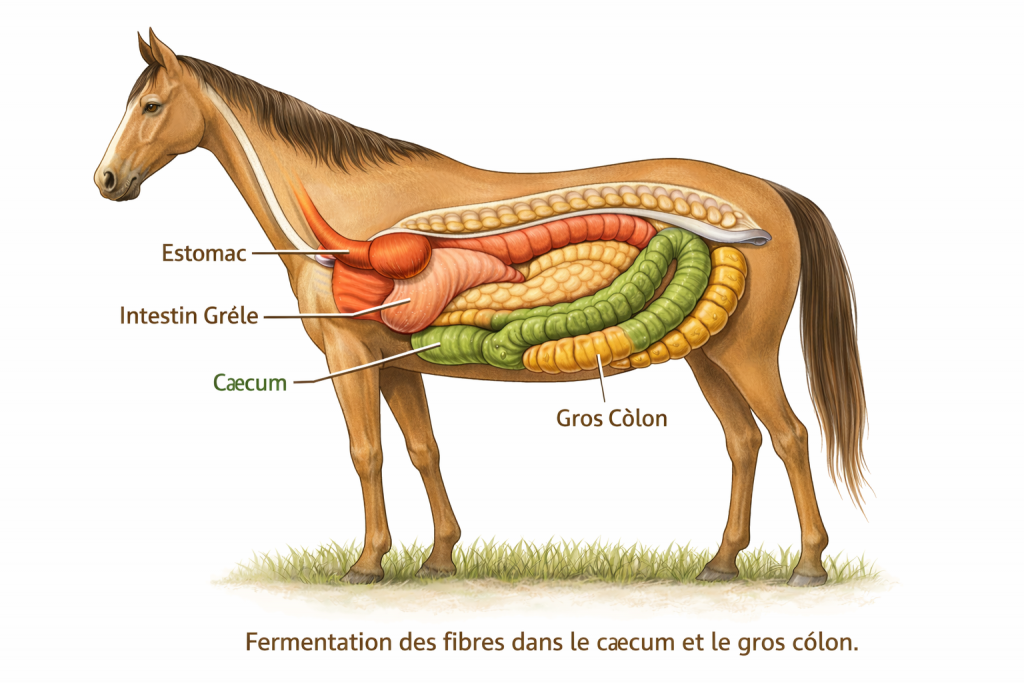 Ces micro-organismes sont indispensables à la digestion des fibres. Sans eux, le cheval ne pourrait pas utiliser correctement le foin et l’herbe comme sources d’énergie.